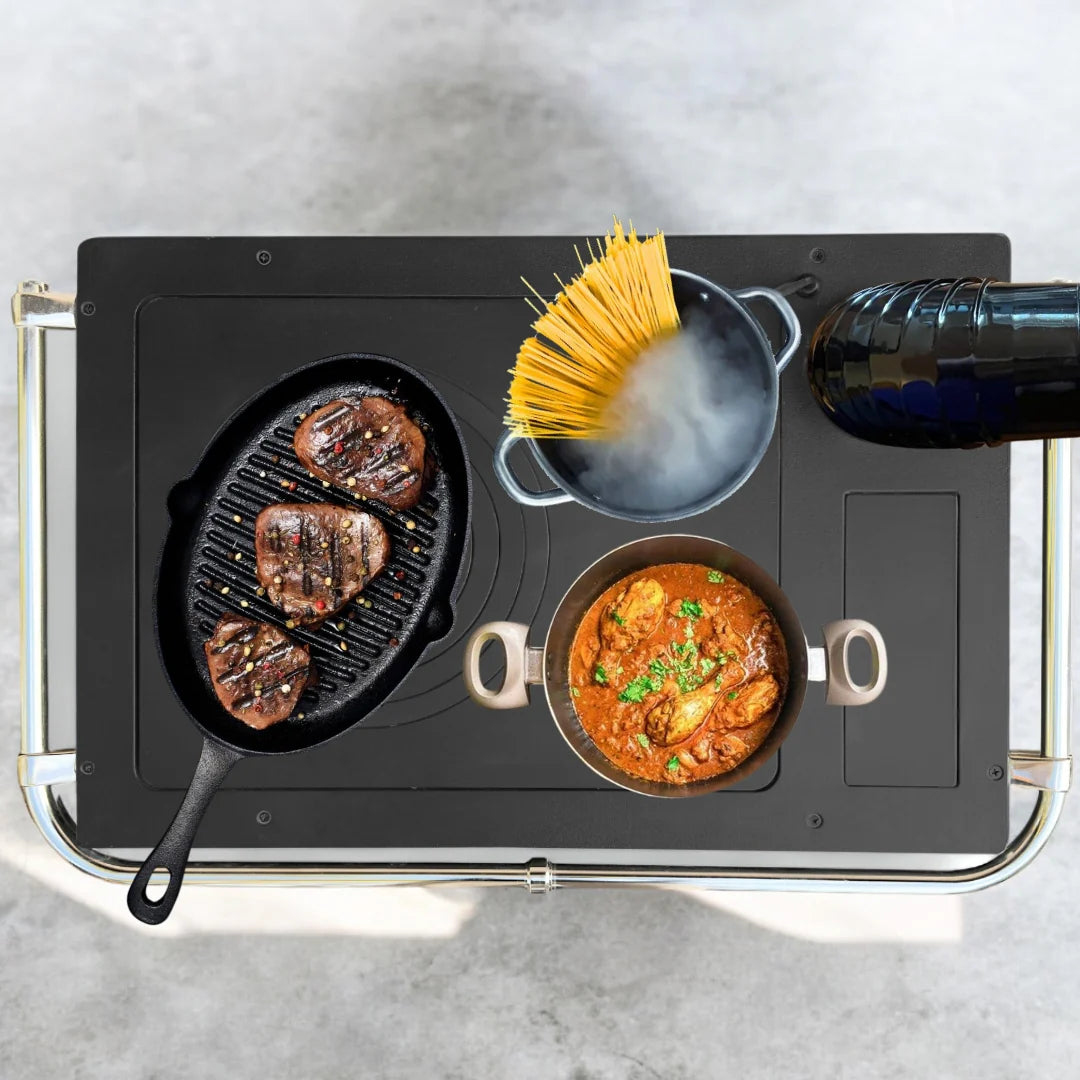 Spēcīga čuguna virsma ar pieciem pielāgojamiem riņķiem — gatavo vieglāk, tīri ātrāk, izbaudi vairāk.