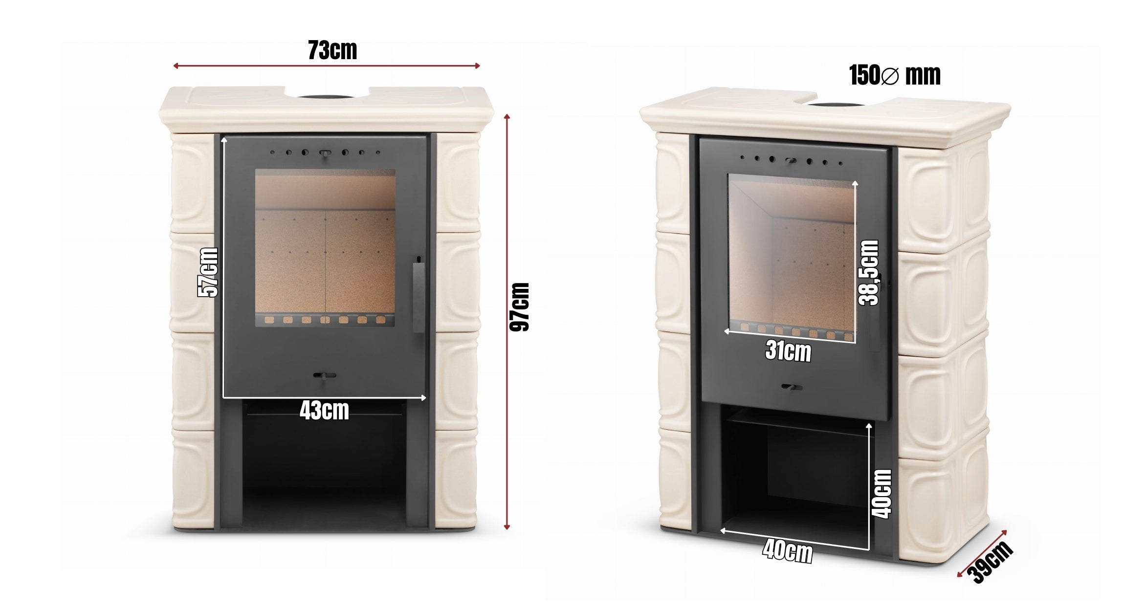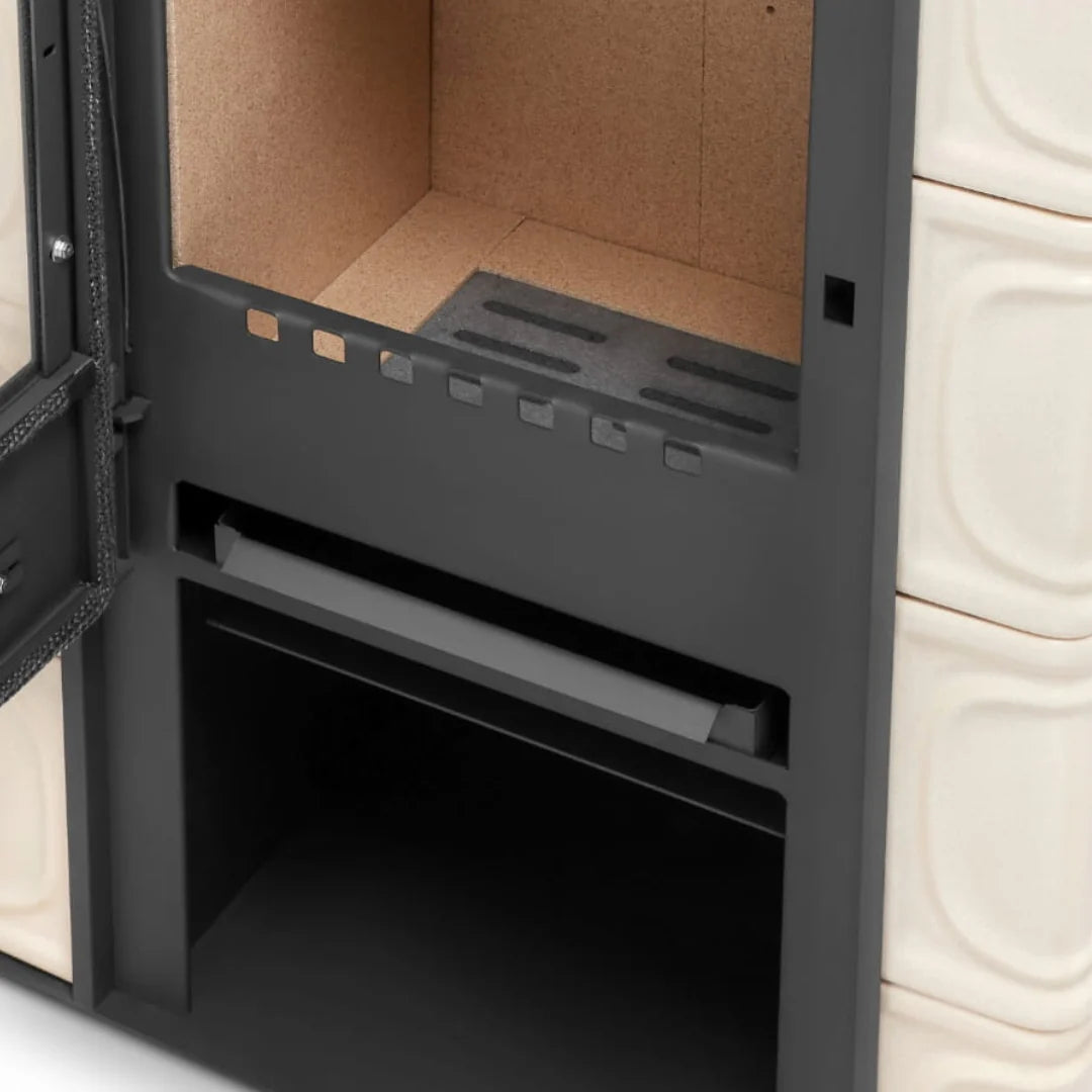 Izturīga konstrukcija ar vermikulīta plāksnēm un biezām tērauda durvīm. Piemērota malkai un briketēm – radīta ilgmūžībai.